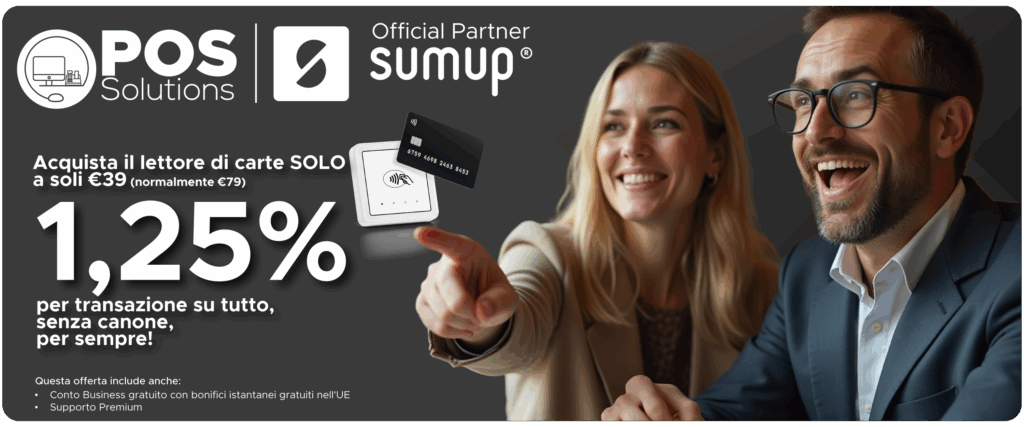Grazie alla collaborazione tra SumUp e POS Solutions, potrai beneficiare di un tasso di commissione agevolato. Inoltre, riceverai uno sconto sull’acquisto del tuo POS.